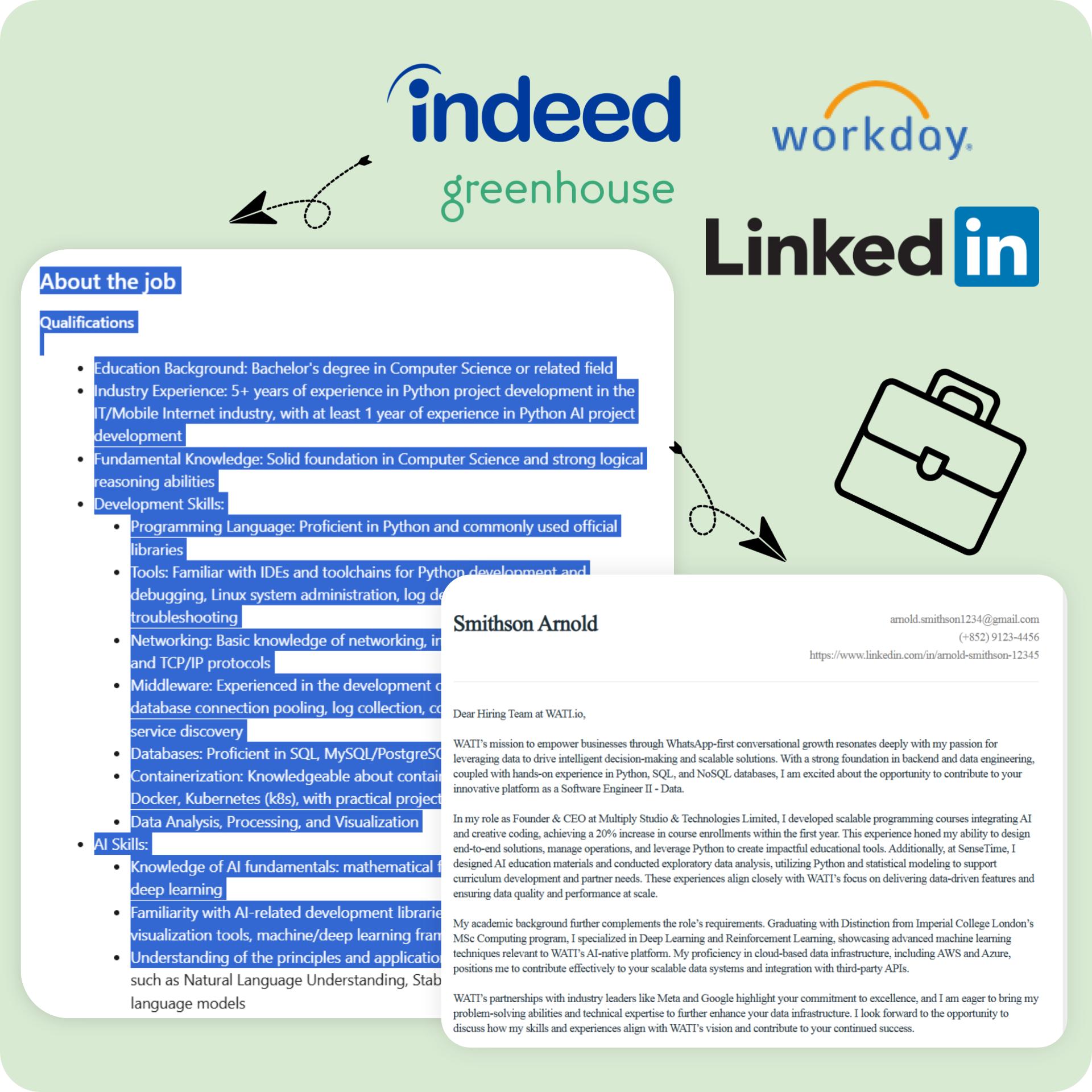 Analyzes each job and highlights your most relevant experiences that perfectly match what employers want.